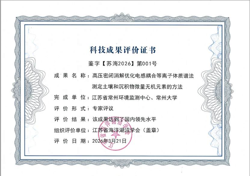 2026年3月21日,江苏省海洋湖沼学会在南京组织召开科技成果评价会,对江苏省常州环境监测中心与常州大学共同完成的“高压密闭消解优化电感耦合等离子体质谱法测定土壤和沉积物微量无机元素的方法”进行评价。学会理事、中国科学院南京地理湖泊研究所张路研究员、南京工业大学唐永明教授、江苏省农业科学院王红春研究员、江苏省渔业生态环境监测站徐虹正高工、常州市环境科学研究院徐宪根研究员组成了评价专家组,张路研究员担任专家组组长,会议由学会常务副秘书长龚伊主持。